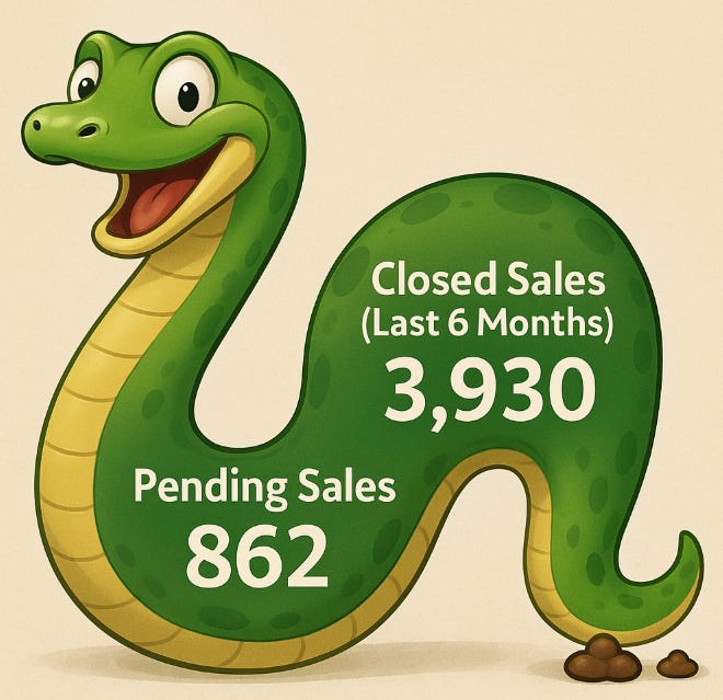 The snake is eating less (pending under contract homes are down), but still pooping out what it ate way back in late May and early June (closings).