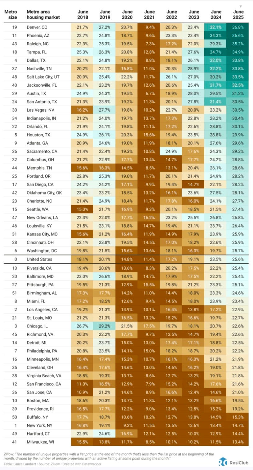 This very long table of Zillow scraped together by ResiClub, self-described as “Your data-driven gateway to the heart of the U.S. housing market,” shows the year-over-year percentage of price cuts for the top 50 real estate metro areas. You can see the increase in price drops. 18.1% of June 2018 real estate transactions in the entire United States, compared to 25.6% of June 2025.