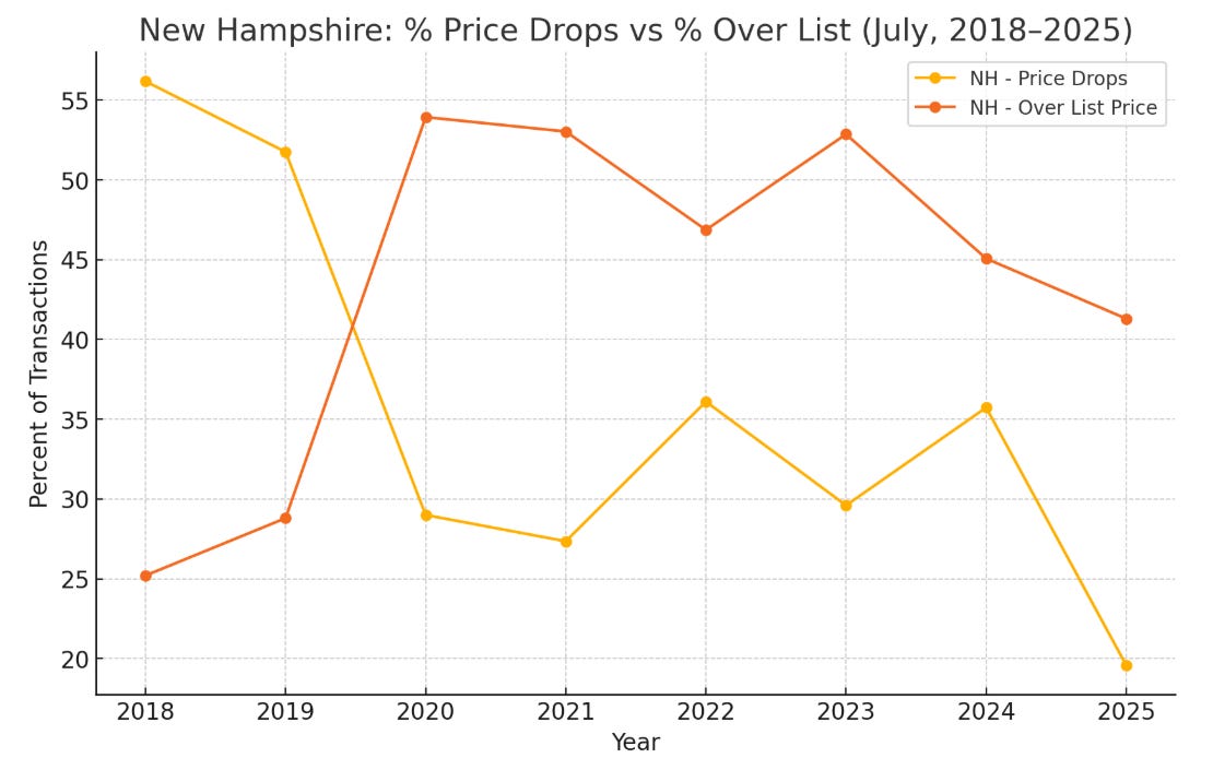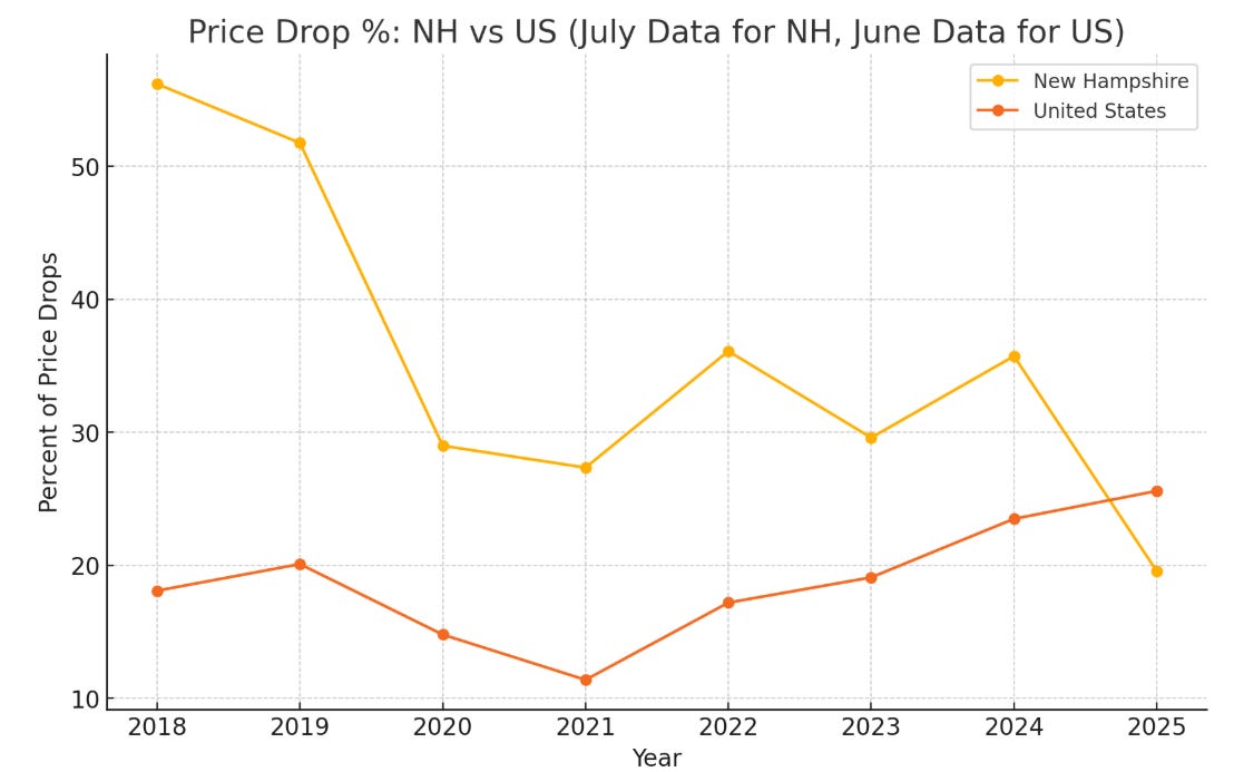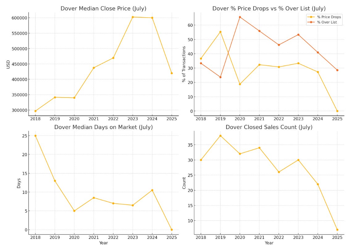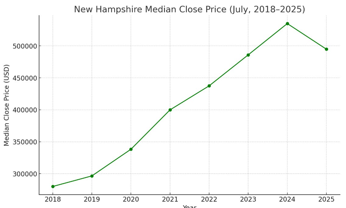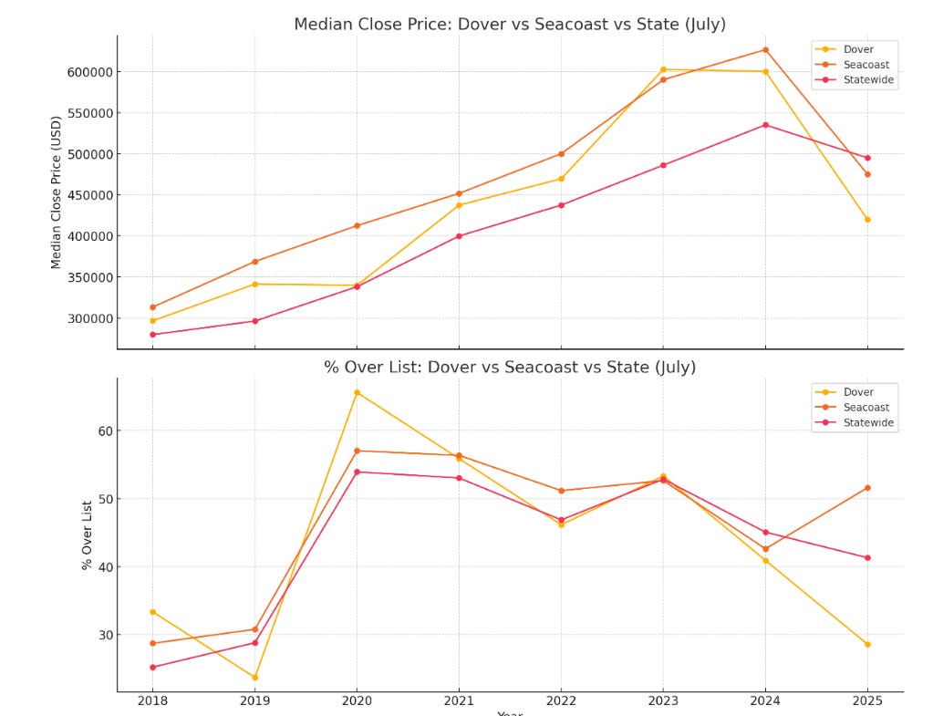 Dover, NH’s median price dropped ~30% year-over-year, from $600,000 in July 2024 to $420,000 in July 2025.
