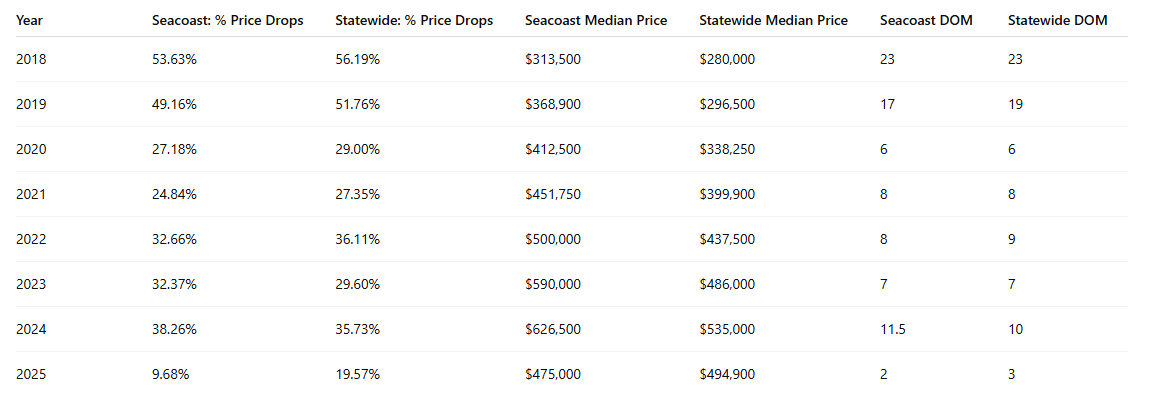And here’s the breakdown for July 2018-2025, comparing the seacoast to the rest of the state overall: