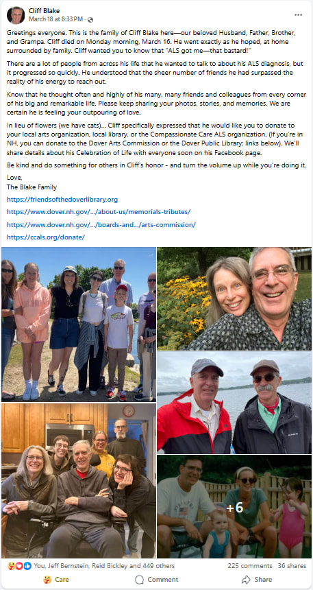 I didn’t know Cliff for long. I met him through the Dover Arts Commission. The Commission was rolling out a new initiative: the Dover Literary Laureate, and they put out a call for applications. New Hampshire has Poet Laureates coming out of our ears—Portsmouth, Rochester, Derry, and Newbury. The Literary Laureate was a bit of a twist, as the goal was not just to promote writing but also to promote literacy. It is through this position that Cliff dragged me into civic life without me really realizing what was happening.