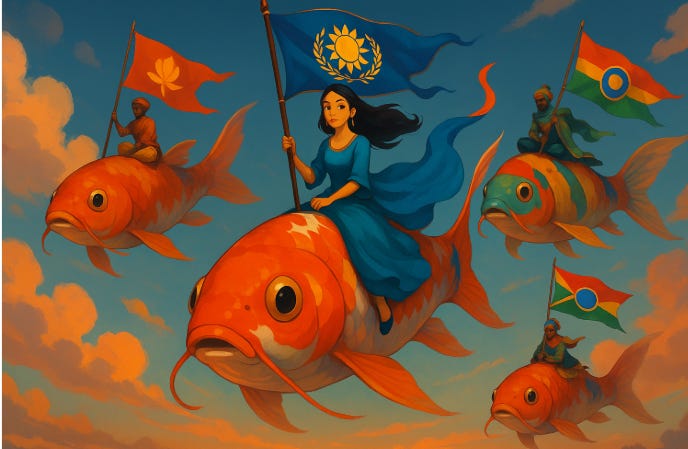 He turns on his jeep headlights so he can see better and then the fish are in front and above him. Giant and floating through and across towards the Mormons in Utah? The potatoes in Idaho? Towards Canada. Away from where they had come. A great migration. And the next thing he sees is unbelievable. Some of the fish are ridden by people sitting behind the wide eyes, homeland flags planted into the fish backs, and he watches, letting them go.