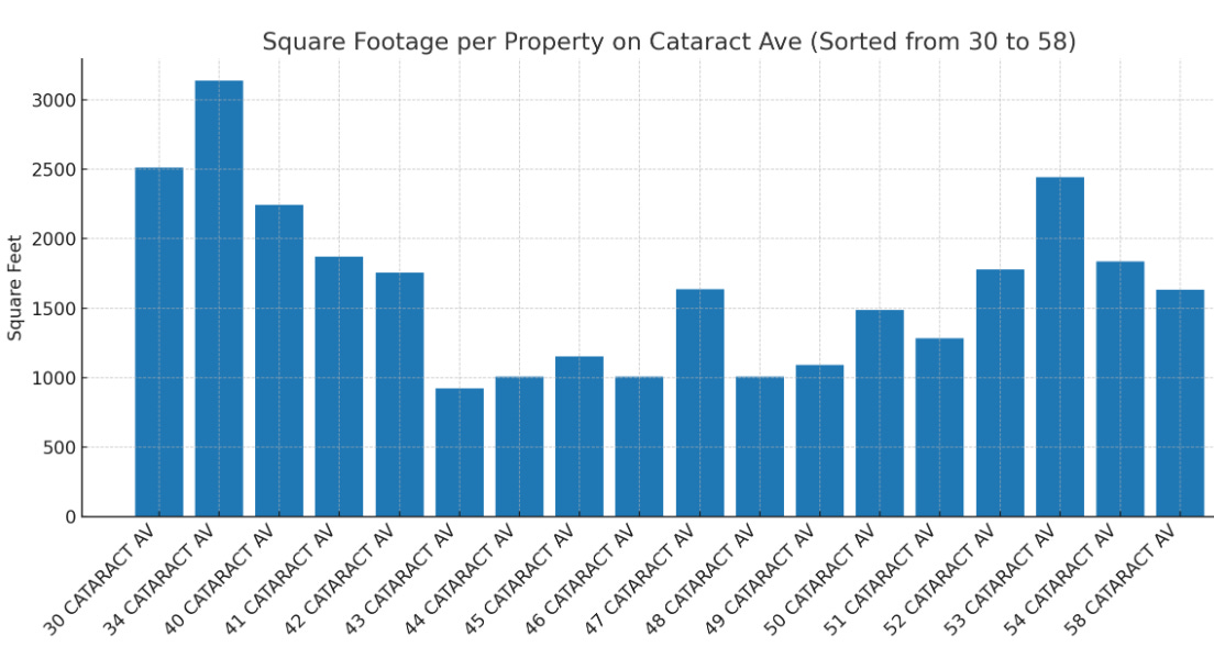 It’s important to note that 34 Catract Avenue dominates the street in relation to square footage. Other large footprints include 30 Cataract, 40 Cataract, and 53 Cataract. If we remove these four homes from the equation, we are left with an average of 1,391.5 square feet.